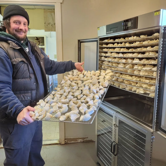 "Waste is always a heartbreaker on a farm. We work so hard to produce healthful food, but if it doesn't get sold or donated what then? I can think back multiple times the last 8 years farming feeling frustrated and sad about food going bad in the walk-in or composting something that we couldn't turn into a shelf stable pantry item.Well- not anymore! This here folks is 130 Sq. Ft. Of drying area! Two bays, two timers, two temperature settings. We dried all of our leftover mushrooms that were just slightly unmarketable, and now we have a shelf stable food processing system.We're both excited and relieved to introduce this tool to the farm, and hopefully, dried mushrooms/powders make it to your kitchen soon too!!!"